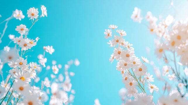 Delicate white daisy-like flowers with bright yellow centers reaching towards radiant, clear turquoise-blue sky, bathed in soft sunbeams, symbolizing spring's renewal and natural beauty.