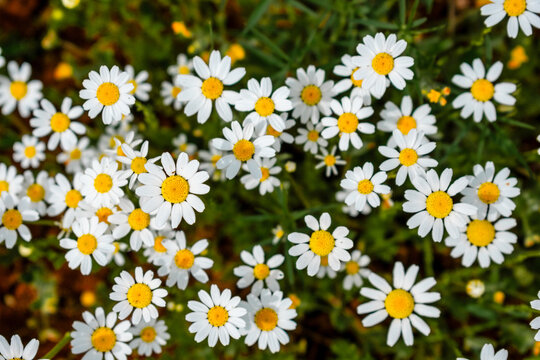 Close-up of blooming white daisies with yellow centers in a wild field. The cheerful flowers capture the essence of spring and the delicate beauty of natural meadows in soft light.
