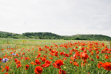 Beautiful wildflowers on a green meadow. Warm summer evening