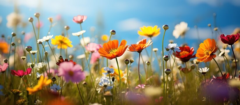 Colorful cosmos flowers in the meadow with blue sky background.