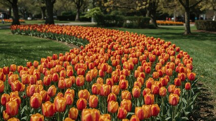Colorful tulips in a park with green grass and trees. Blooming flowers and nature. Springtime garden scene.