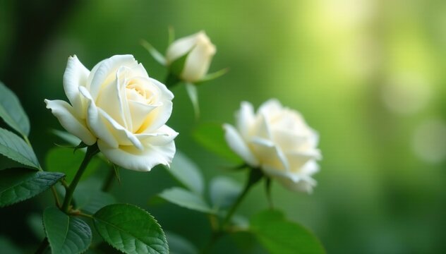 Soft focus white roses nestled among lush greenery with subtle hints of rose, nature, flowerpower