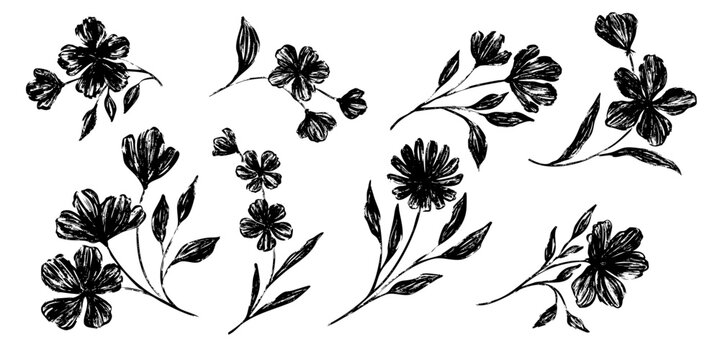 Flower abstract hand drawn brush ink or chalk stroke. Sketch hand drawn silhouette floral plant, leaf grunge abstract vector illustration. Simple flower, leaf charcoal, pencil, crayon style elements