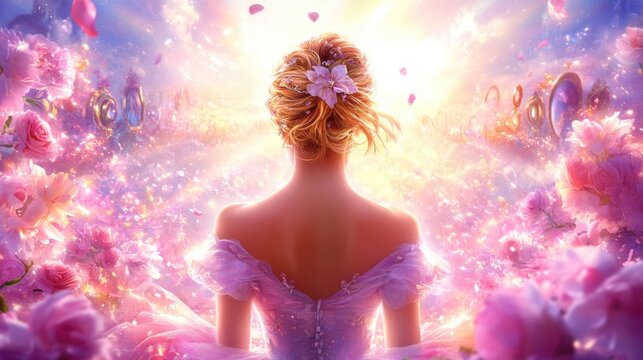Enchanting princess in magical garden of blossoming roses at sunrise