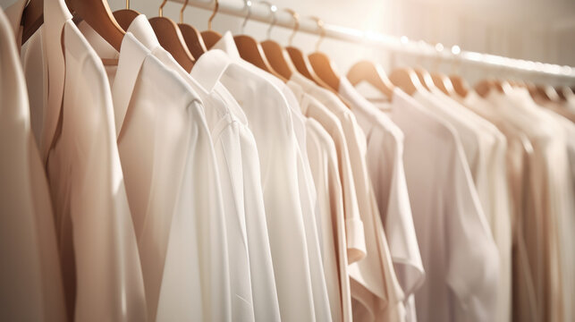 Assortment of shirts and blouses in neutral tones hangs on hangers in closet