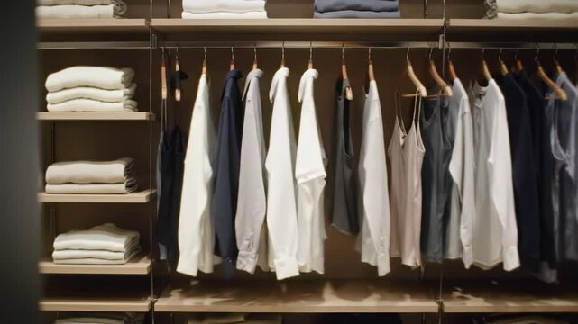 Neatly organized closet with various neutral-toned shirts, blouses, and tops hanging on wooden hangers on a shelf. Folded clothes are visible on the shelves above