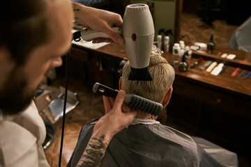 Confident barber styling man with blower
