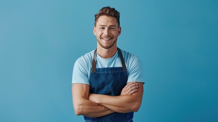 A front-view mockup of a blue apron, worn by a man standing in a high-end, marble-countertop kitchen, with space for a restaurant logo or custom branding on the apron