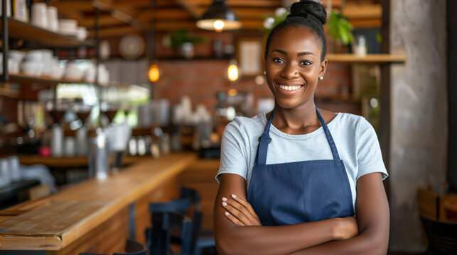 Confident smiling African American female barista in blue apron standing in a cozy cafe. Small business concept.