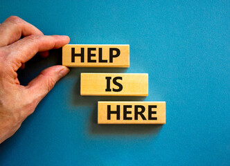 Help is here and support symbol. Concept words Help is here on wooden blocks on beautiful blue table blue background. Businessman hand. Business, support, help is here concept. Copy space.