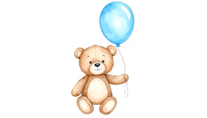 Cute teddy bear holding a blue balloon.  Watercolor style