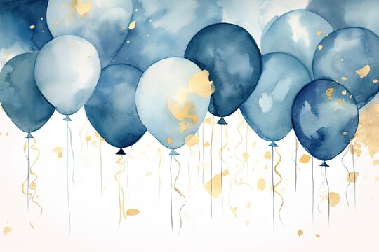 A watercolor illustration of blue balloons with gold accents, perfect for celebrations.