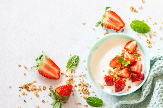 Yogurt with granola and strawberry in blue bowl at white stone table. Top view with copy space.