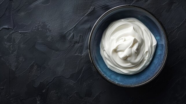 A minimalist top view of Greek yogurt served in a blue bowl