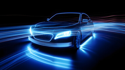 Sleek blue car speeding on a sunlit highway under clear skies. Modern vehicle design, dynamic road travel scene, perfect for automotive ads. AI