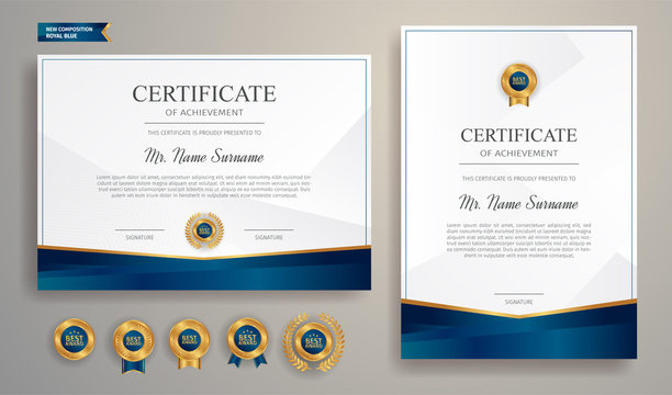 Dark blue and gold certificate template. Modern blue certificate award or diploma template set of two, portrait and landscape design in A4 size. Suit for business, education, award and more