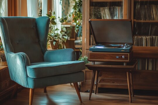 Blue chair and changing table for infants. interior of a spacious children's room.