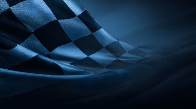 Abstract blue checkered flag waving in the wind, symbolizing racing, competition, victory, and dynamic movement with a modern, futuristic design.
