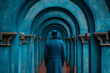 fashion portrait of young elegant woman in blue coat on blue background : Generative AI