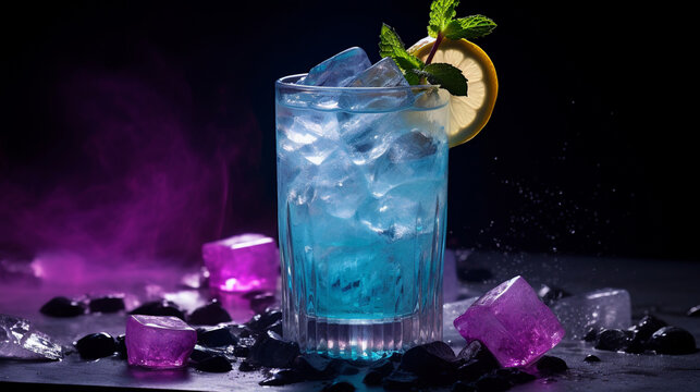 Summer cold galaxy blue cocktail made from Thai Butterfly pea tea. There are purple ice cubes on the table.