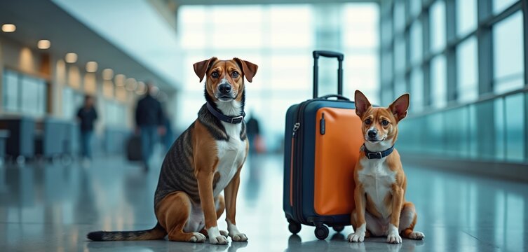 Brown dog and small dog sit near orange luggage in airport. Animals travel together. Dogs wear blue collars. They are indoors in a large bright room with shiny floor and many windows.