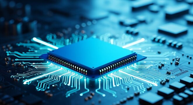 Abstract glowing blue computer chip and circuit board with digital connections