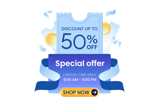 Special offer. Discount up to 50% off banner with blue coupon and white background. Coin and blue ribbon for decoration. Use for social media, website, Campaign or promotion.