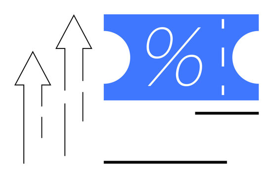 Upward arrows next to a blue coupon with a percentage sign, signifying economic growth, financial success, and discounts. Ideal for finance, marketing, sales, business growth, interest rates