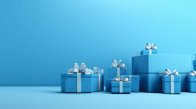 Blue background. Xmas dark blue teal gift box and gold ribbon bow from above for text Merry Christmas, Happy New Year and Black Friday season. Horizontal banner, header for website vector illustration