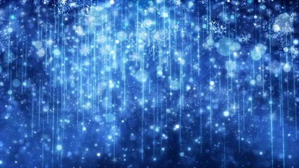 Christmas snowflakes, particles shower and soft bokeh on a blue festive background.