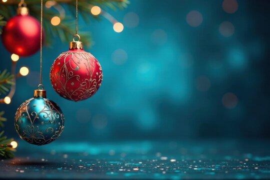 Ornament elements hanging from blue background with festive patterns and lights, ornament, blue, festive