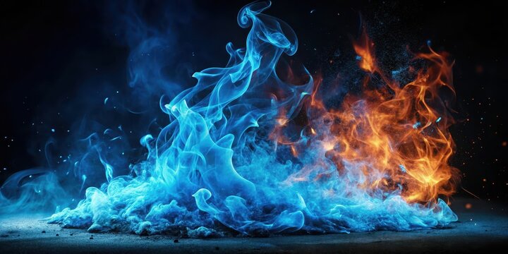 Intense fiery blue flame on dark black background with smoke and ash particles suspended in mid-air
