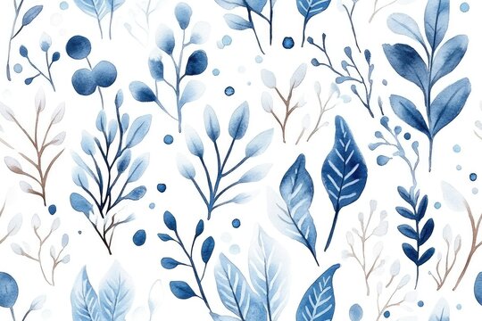 Watercolor blue floral seamless pattern with delicate leaves and branches.