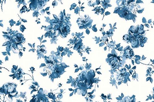 Classic French toile de Jouy blue floral pattern with elegant white roses, hydrangeas and daisies on a soft, muted background