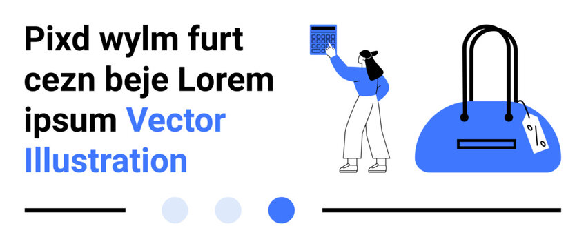 Woman examining an item in her hand while holding a blue bag. The illustration features prominent text in black and blue fonts and several design elements. Ideal for e-commerce, retail, fashion