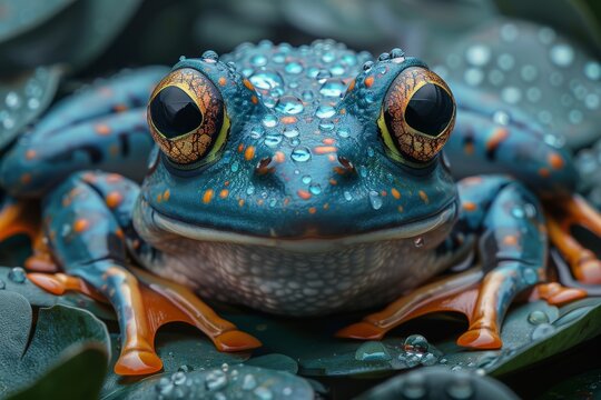 A vivid close-up of a blue frog with orange limbs and big eyes among wet green leaves