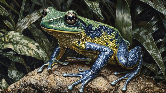A blue frog with goldringed eyes rests among orange and yellow leaves