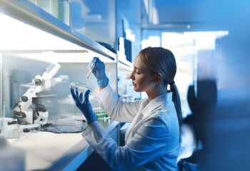 A woman in a white lab coat and blue gloves works in a laboratory, carefully dropping a liquid from a dropper into a petri dish.
