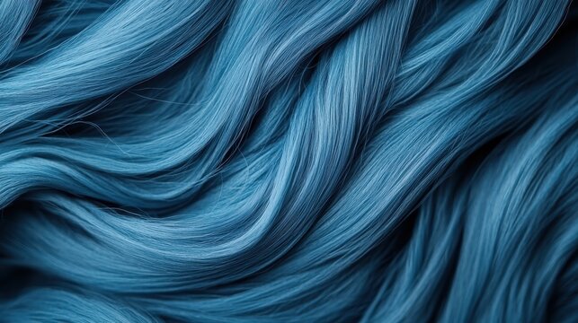 Close-up view of long, flowing strands of blue hair, artistically arranged in a swirling pattern, creating a visually captivating and textured appearance.