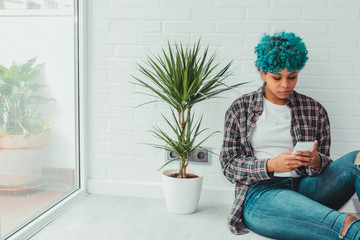 A young blogger or gamer of bright appearance, with blue hair, records podcast. Girl Student Streamer conducts a review