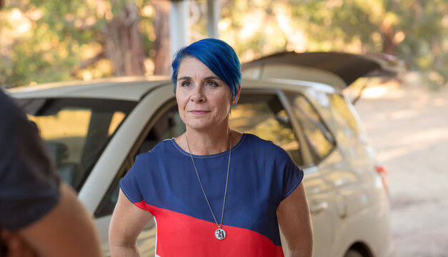 Woman with blue hair in front of a car