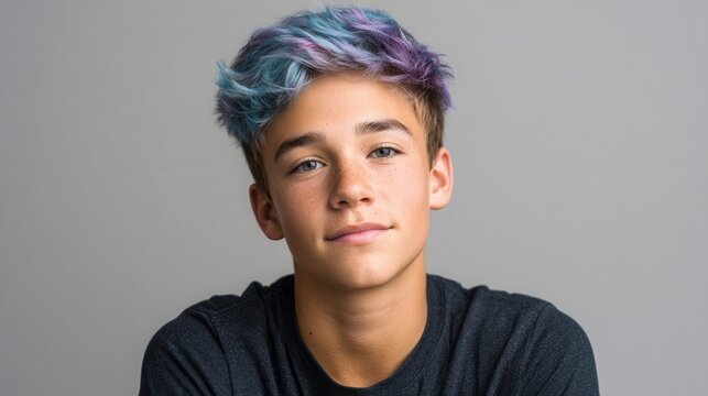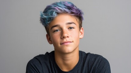 A young male with stylish purple and blue hair poses against a neutral background, showcasing a confident expression and modern hairstyle.