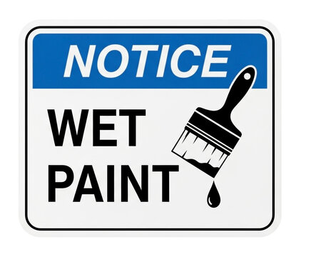 A clear white sign with a blue header displaying the word notice above the bold black text wet paint and a dripping paintbrush isolated on transparent background