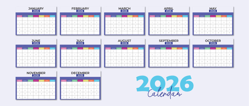 2026,calendar,weekly flat vector 2026 calendar template showing clean weekly layout grid with blue header design