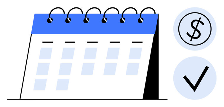 Desk calendar with blue header, dollar sign for finances, and checkmark for task completion. Ideal for scheduling, organization, time management, productivity, financial planning, accountability