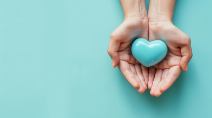 High angle shot of open hands holding a blue heart on a gentle teal background