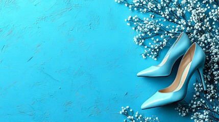 Spring Sale with Blue Heels Surrounded by Flowers Against a Soft Background