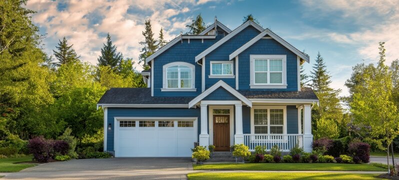 The beautiful blue house surrounded by lush greenery and bright skies.