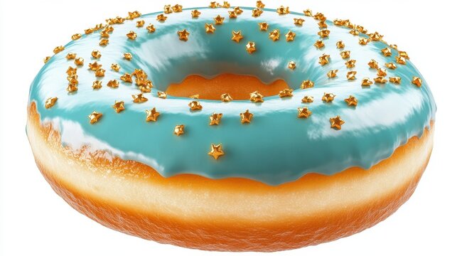 Glazed Donut with Blue Icing and Gold Star Sprinkles on White Background