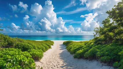 Beautiful sandy pathway leading to a tranquil beach with turquoise water and vibrant green foliage under a blue sky with clouds Copy Space